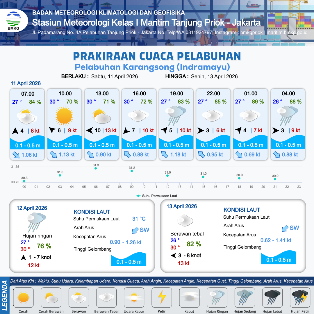 11 Apr 26, 23.00 6 jam kedepan | Selatan 1 kt Gust Peningkatan kecepatan angin yang singkat dan tiba-tiba : 5 kt | 0.3 m Tenang | Tenggara 1.0 Knot | 9 km | 26 °C | 92 % | +0.50 m |