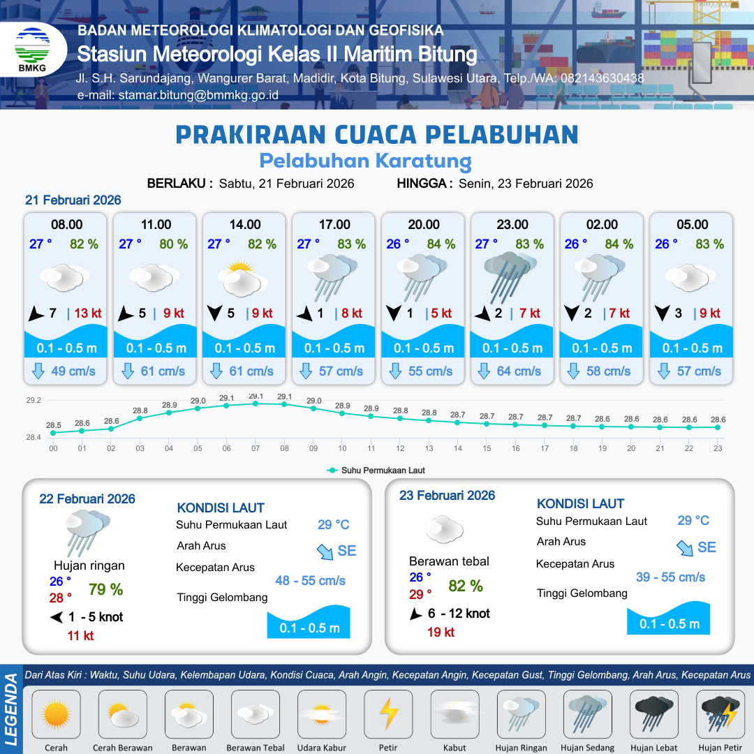 21 Feb 26, 23.00 5 jam kedepan | Cerah Berawan | Utara 3 kt Gust Peningkatan kecepatan angin yang singkat dan tiba-tiba : 10 kt | | | 9 km | 27 °C | 82 % | +0.17 m |