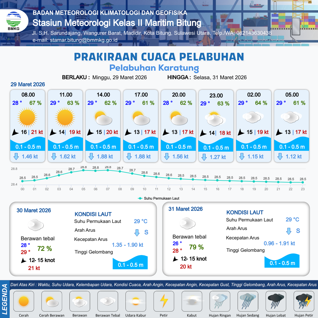29 Mar 26, 06.00 3 jam kedepan | Timur Laut 15 kt Gust Peningkatan kecepatan angin yang singkat dan tiba-tiba : 20 kt | 0.2 m Tenang | Selatan 1.9 Knot | 10 km | 29 °C | 62 % | +0.18 m | |