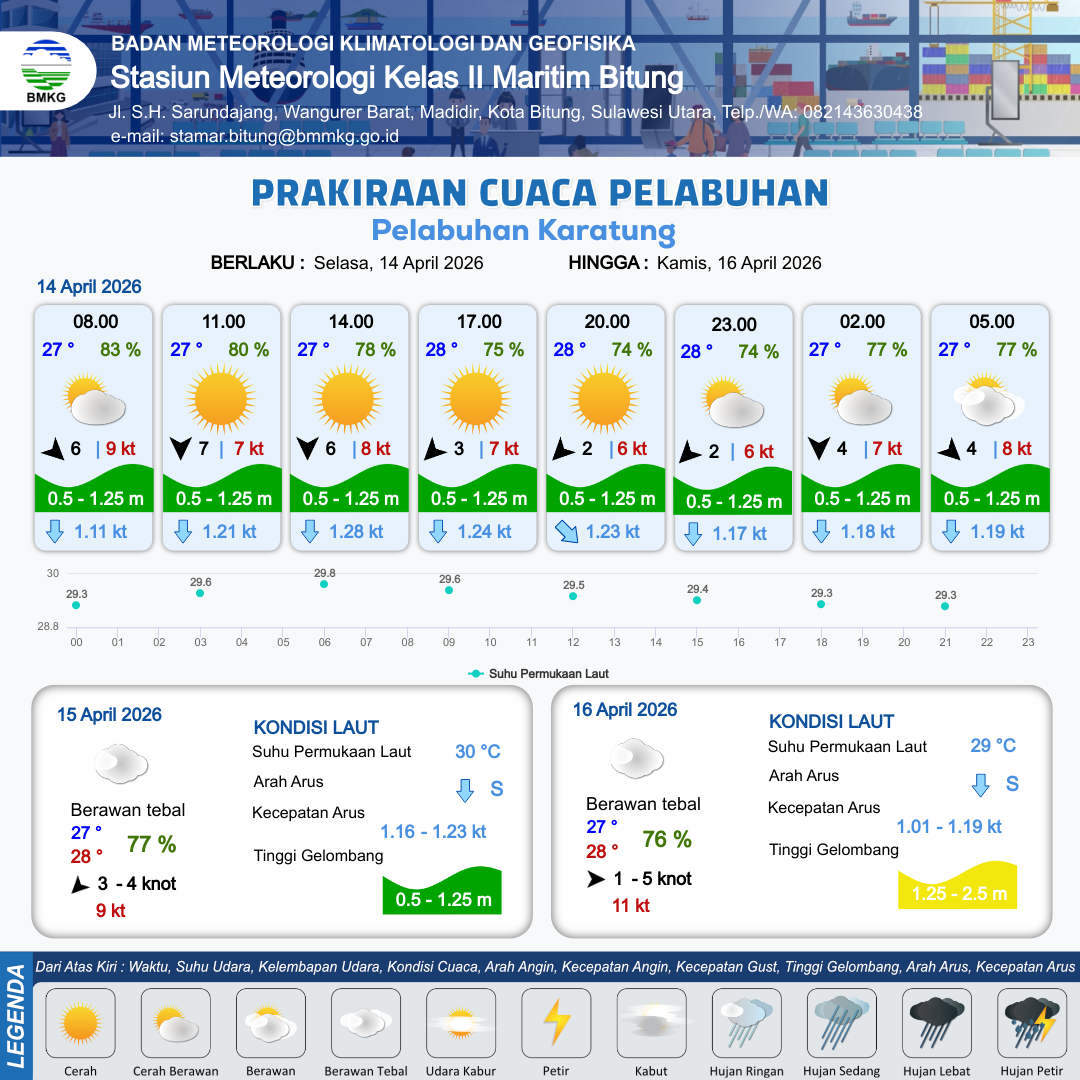 13 Apr 26, 14.00 6 jam yang lalu | Berawan | Barat Laut 8 kt Gust Peningkatan kecepatan angin yang singkat dan tiba-tiba : 7 kt | | | 10 km | 27 °C | 83 % | +0.52 m |
