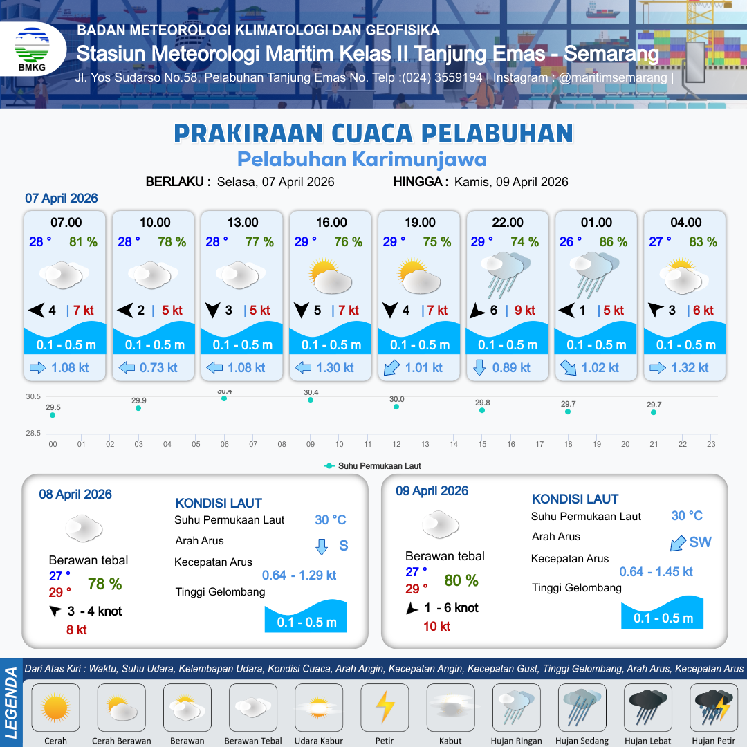 7 Apr 26, 03.00 4 jam kedepan | Timur 2 kt Gust Peningkatan kecepatan angin yang singkat dan tiba-tiba : 5 kt | 0.1 m Tenang | Barat 0.7 Knot | 10 km | 28 °C | 78 % | +0.63 m | |