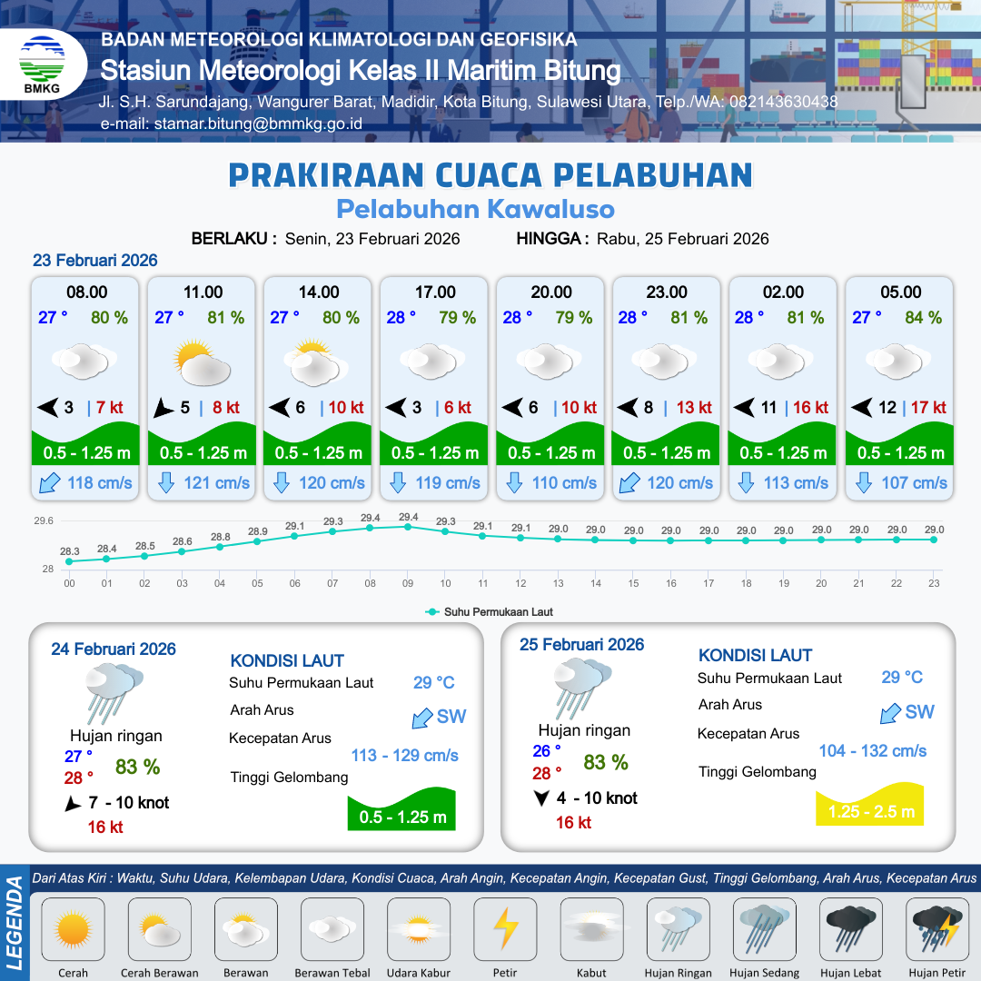 22 Feb 26, 23.00 3 jam kedepan | Hujan Ringan | Timur Laut 5 kt Gust Peningkatan kecepatan angin yang singkat dan tiba-tiba : 10 kt | | | 10 km | 27 °C | 82 % | +0.22 m |