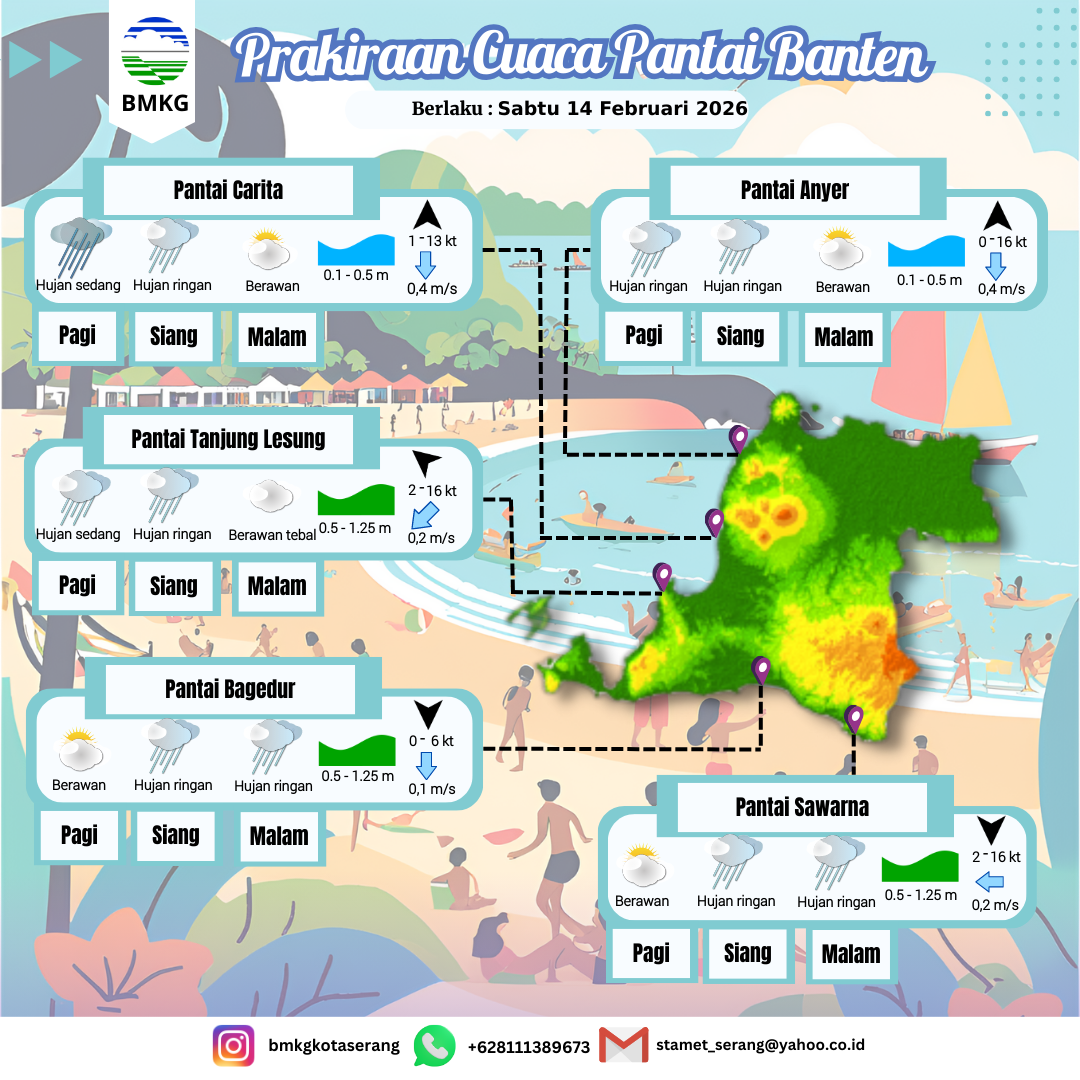 13 Feb 26, 23.00 3 jam kedepan | Hujan Ringan | Barat Daya 4 kt Gust Peningkatan kecepatan angin yang singkat dan tiba-tiba : 7 kt | | | 7 km | 26 °C | 96 % | +0.00 m |