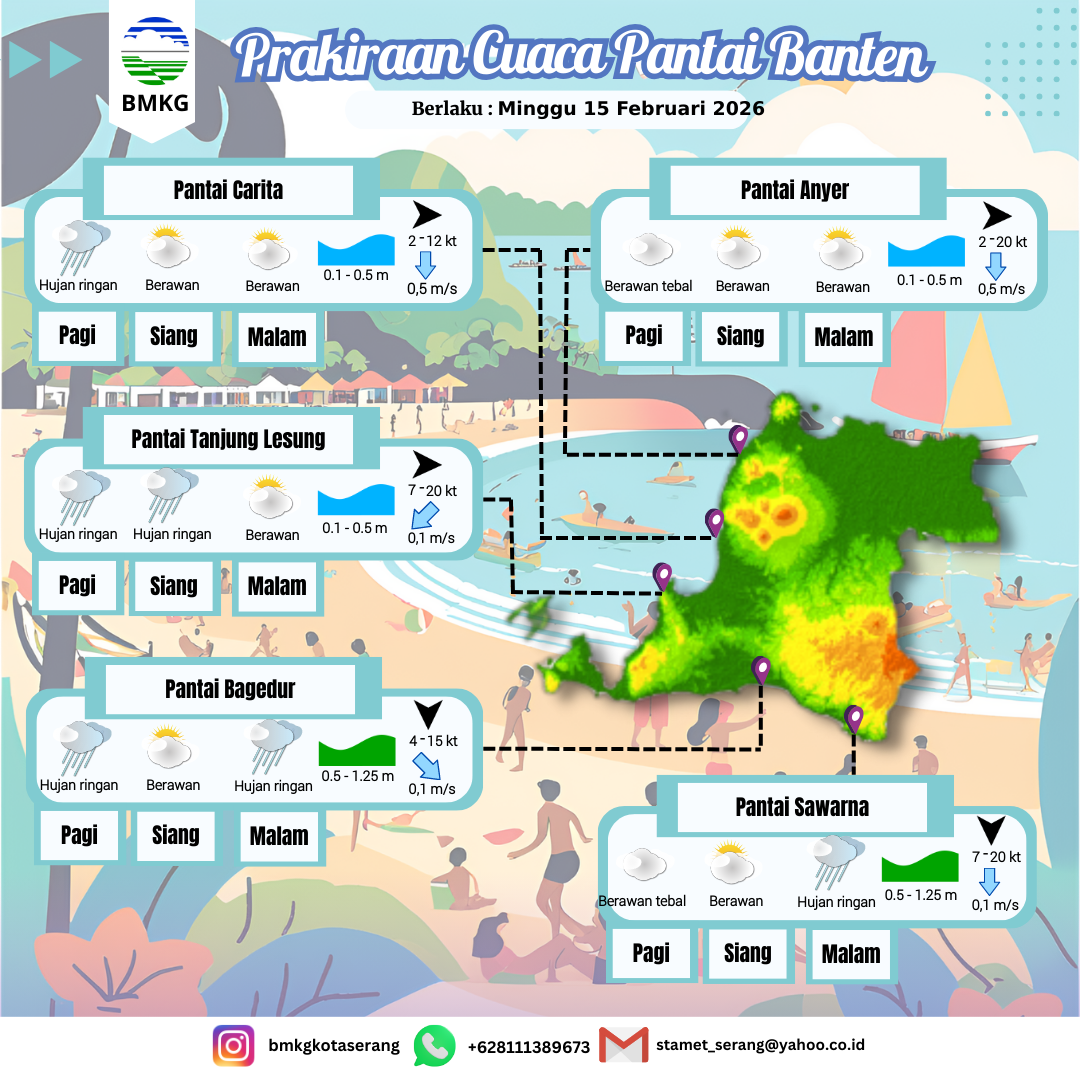 15 Feb 26, 12.00 15 jam kedepan | Barat Daya 7 kt Gust Peningkatan kecepatan angin yang singkat dan tiba-tiba : 15 kt | 0.3 m Tenang | Timur Laut 60.0 cm/s | 10 km | 27 °C | 84 % | +0.01 m | |