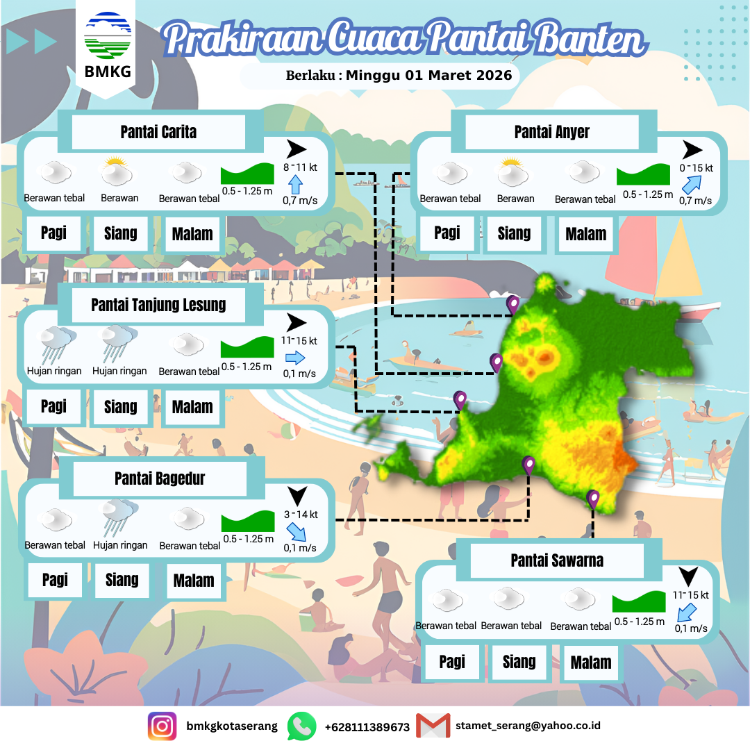1 Mar 26, 23.00 5 jam kedepan | Berawan Tebal | Barat 6 kt Gust Peningkatan kecepatan angin yang singkat dan tiba-tiba : 15 kt | | | 10 km | 25 °C | 85 % | +0.29 m |