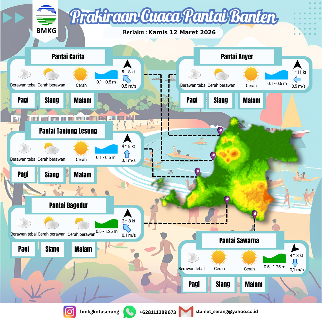 11 Mar 26, 06.00 14 jam yang lalu | Berawan | Barat 10 kt Gust Peningkatan kecepatan angin yang singkat dan tiba-tiba : 21 kt | | | 10 km | 29 °C | 77 % | +0.07 m |