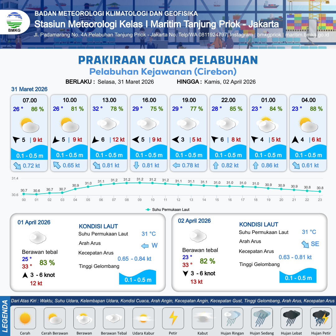 31 Mar 26, 05.00 14 jam yang lalu | Berawan Tebal | Timur Laut 6 kt Gust Peningkatan kecepatan angin yang singkat dan tiba-tiba : 13 kt | | | 10 km | 30 °C | 80 % | +0.00 m |