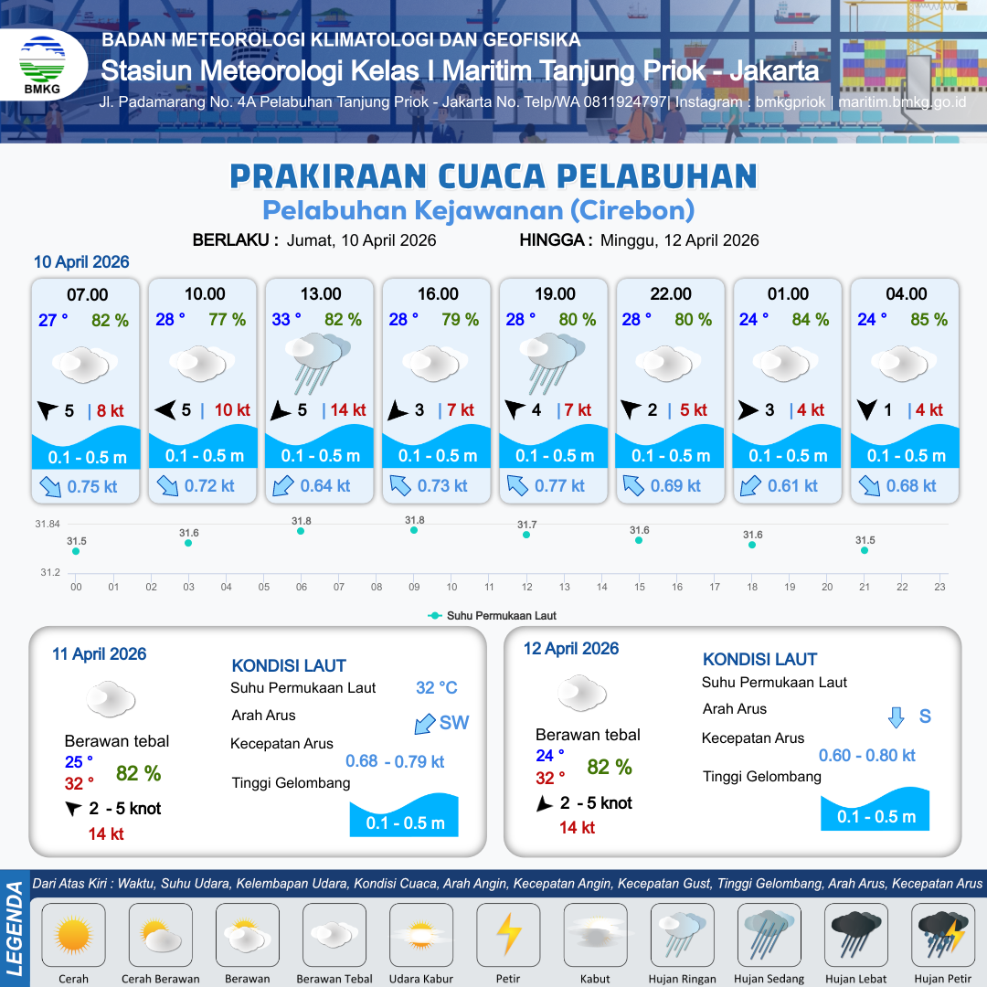 10 Apr 26, 16.00 9 jam kedepan | Tenggara 2 kt Gust Peningkatan kecepatan angin yang singkat dan tiba-tiba : 3 kt | 0.3 m Tenang | Barat Laut 0.7 Knot | 10 km | 27 °C | 79 % | +0.60 m | |