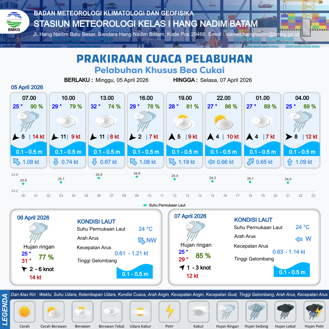 5 Apr 26, 21.00 2 jam kedepan | Hujan Ringan | Barat 8 kt Gust Peningkatan kecepatan angin yang singkat dan tiba-tiba : 12 kt | | | 10 km | 25 °C | 89 % | +0.50 m |