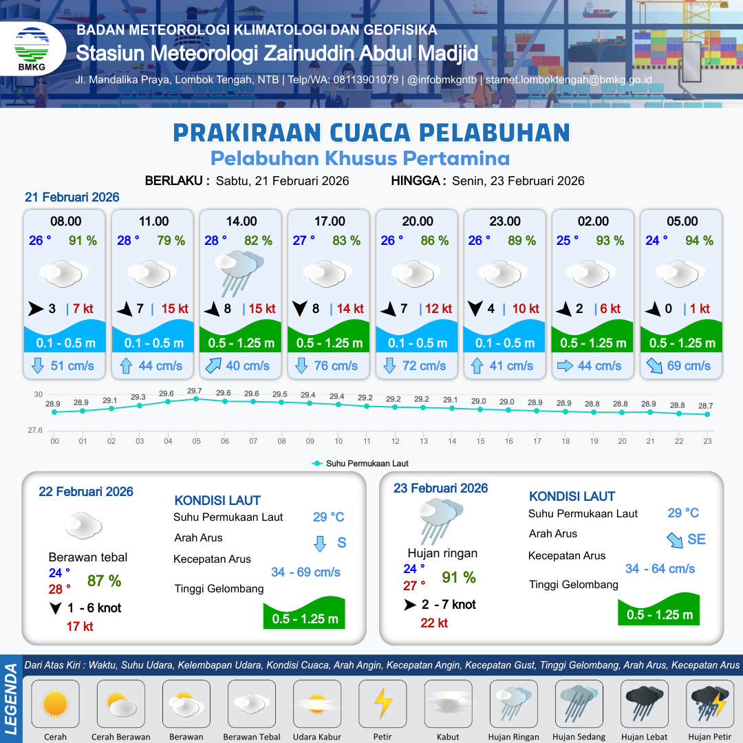 21 Feb 26, 23.00 11 jam kedepan | Utara 1 kt Gust Peningkatan kecepatan angin yang singkat dan tiba-tiba : 8 kt | 0.5 m Rendah | Selatan 68.0 cm/s | 10 km | 25 °C | 95 % | -0.36 m |