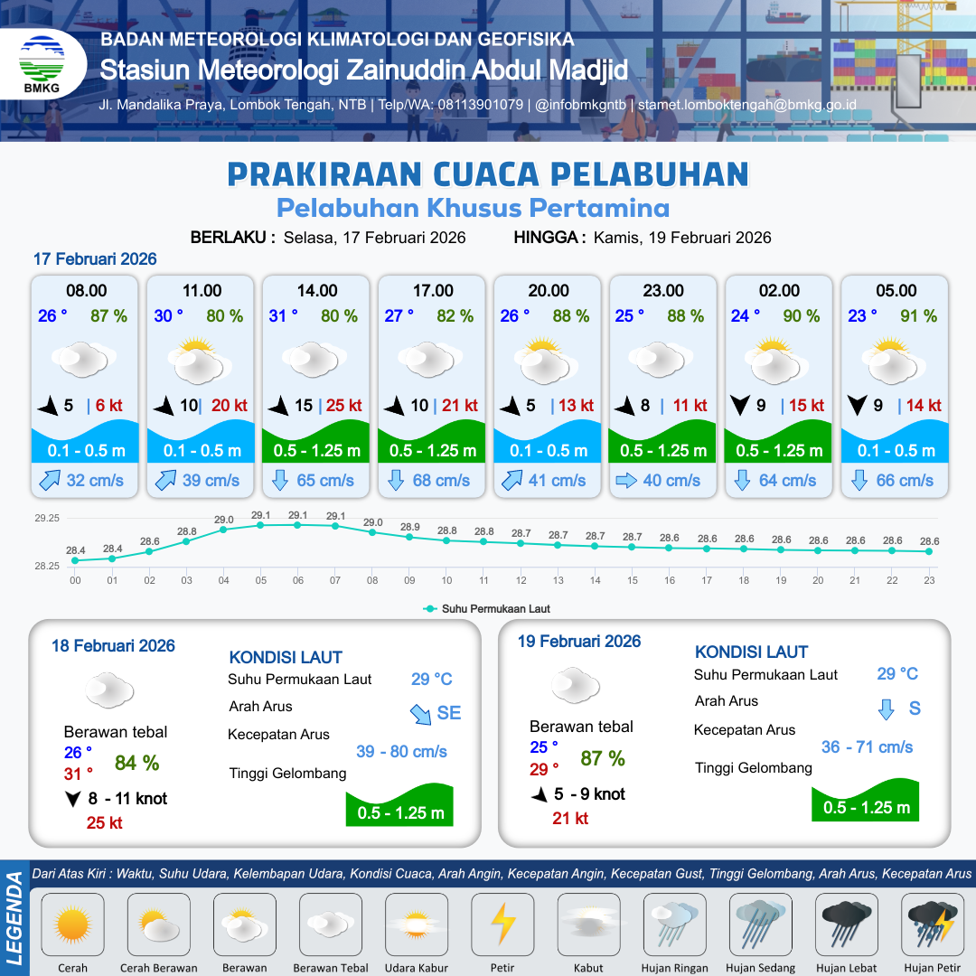 17 Feb 26, 23.00 12 jam kedepan | Utara 10 kt Gust Peningkatan kecepatan angin yang singkat dan tiba-tiba : 13 kt | 0.4 m Tenang | Selatan 55.0 cm/s | 7 km | 25 °C | 90 % | -0.87 m |