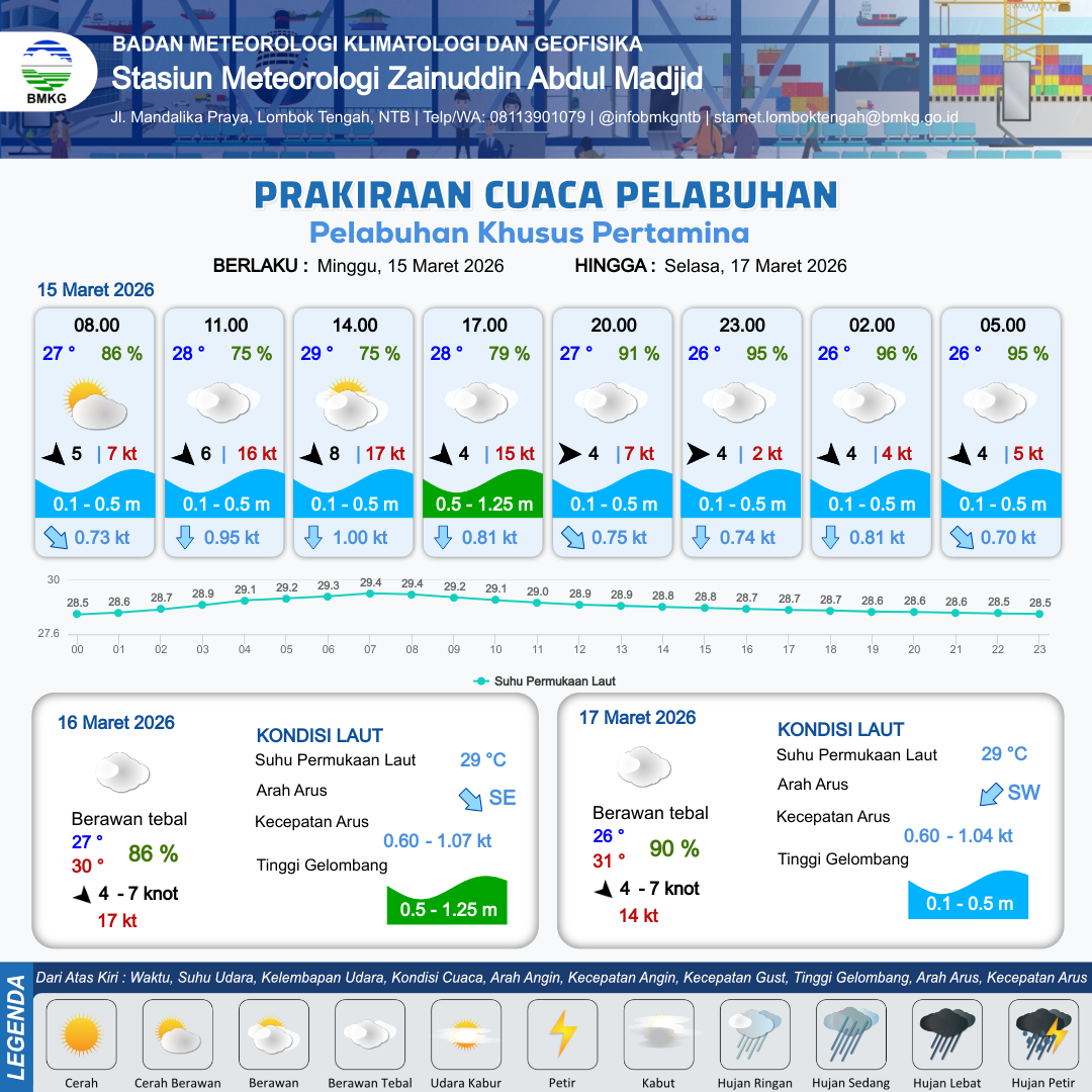 15 Mar 26, 15.00 6 jam kedepan | Barat 4 kt Gust Peningkatan kecepatan angin yang singkat dan tiba-tiba : 2 kt | 0.5 m Rendah | Selatan 0.7 Knot | 9 km | 26 °C | 95 % | +0.17 m | |