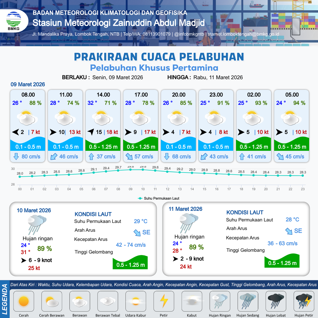 9 Mar 26, 19.00 2 jam kedepan | Barat 5 kt Gust Peningkatan kecepatan angin yang singkat dan tiba-tiba : 10 kt | 0.7 m Rendah | Barat Laut 36.0 cm/s | 8 km | 25 °C | 93 % | -0.19 m | |