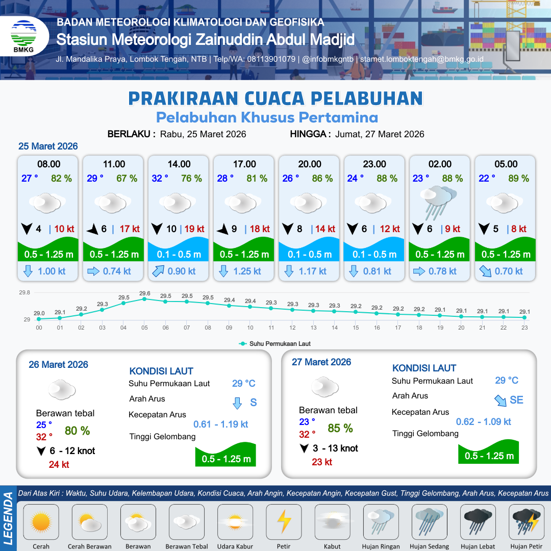 25 Mar 26, 13.00 2 jam kedepan | Utara 8 kt Gust Peningkatan kecepatan angin yang singkat dan tiba-tiba : 15 kt | 0.5 m Rendah | Selatan 1.3 Knot | 8 km | 25 °C | 86 % | -0.35 m | |