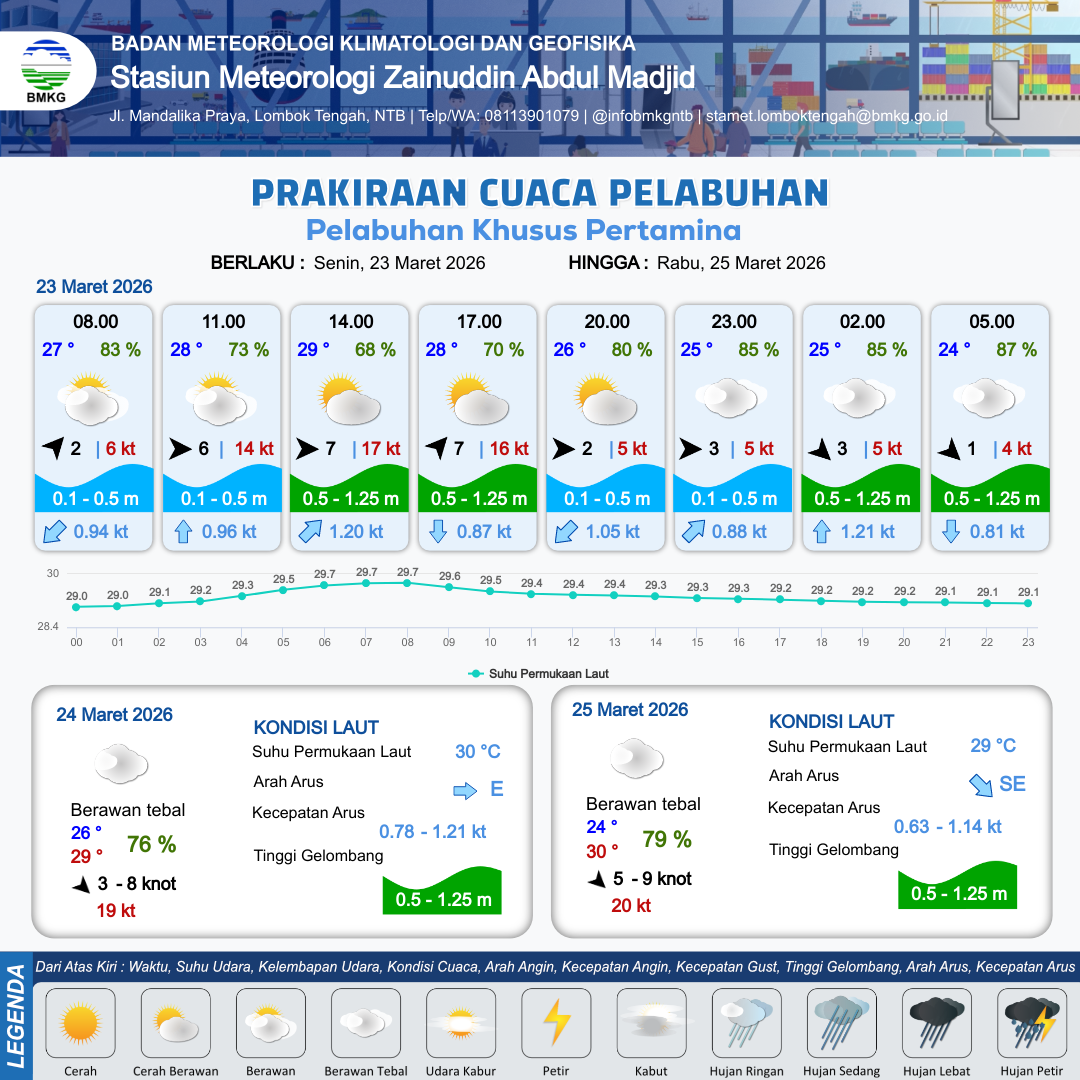 23 Mar 26, 23.00 18 jam kedepan | Barat 3 kt Gust Peningkatan kecepatan angin yang singkat dan tiba-tiba : 6 kt | 0.5 m Rendah | Selatan 1.0 Knot | 10 km | 25 °C | 88 % | -0.03 m |