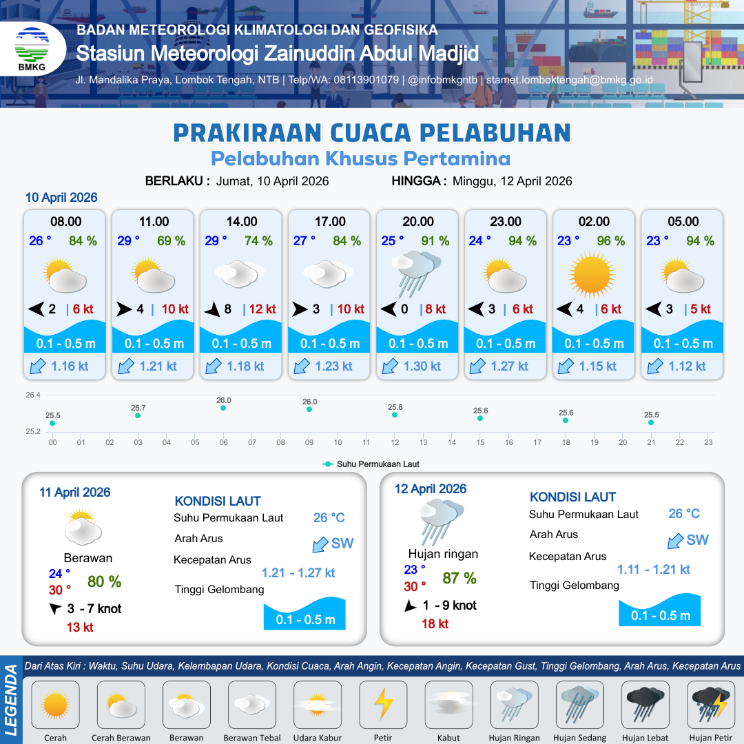 10 Apr 26, 04.00 15 jam yang lalu | Berawan | Barat 4 kt Gust Peningkatan kecepatan angin yang singkat dan tiba-tiba : 11 kt | | | 10 km | 29 °C | 73 % | +0.48 m |