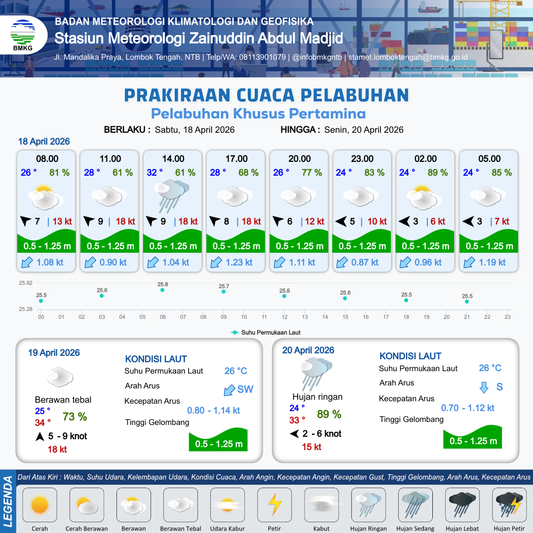 18 Apr 26, 23.00 14 jam kedepan | Timur 5 kt Gust Peningkatan kecepatan angin yang singkat dan tiba-tiba : 7 kt | 0.6 m Rendah | Selatan 1.1 Knot | 9 km | 25 °C | 82 % | +0.48 m |