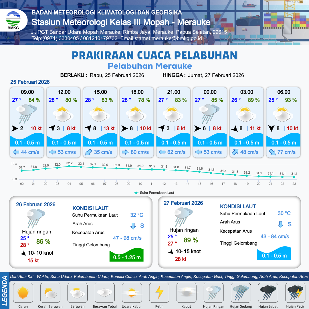 25 Feb 26, 02.00 4 jam kedepan | Barat Laut 5 kt Gust Peningkatan kecepatan angin yang singkat dan tiba-tiba : 12 kt | 0.1 m Tenang | Barat Daya 93.0 cm/s | 9 km | 31 °C | 68 % | +0.15 m | |
