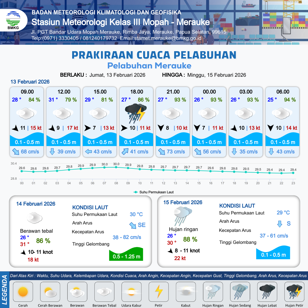 13 Feb 26, 07.00 10 jam yang lalu | Berawan Tebal | Barat 4 kt Gust Peningkatan kecepatan angin yang singkat dan tiba-tiba : 15 kt | | | 8 km | 27 °C | 93 % | -0.46 m |
