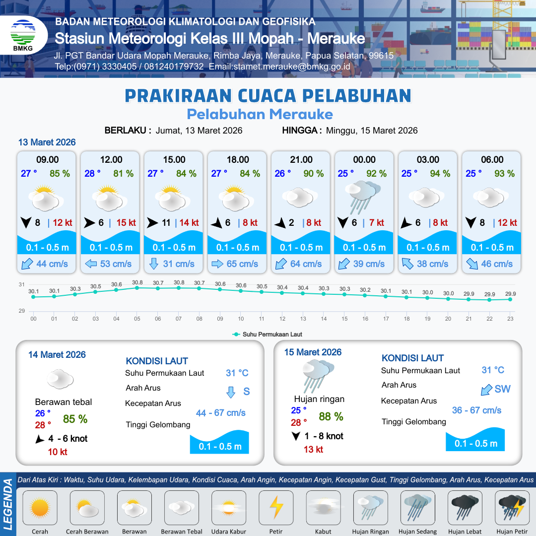 13 Mar 26, 09.00 12 jam kedepan | Barat 5 kt Gust Peningkatan kecepatan angin yang singkat dan tiba-tiba : 10 kt | 0.1 m Tenang | Timur Laut 40.0 cm/s | 9 km | 25 °C | 97 % | -0.68 m | |