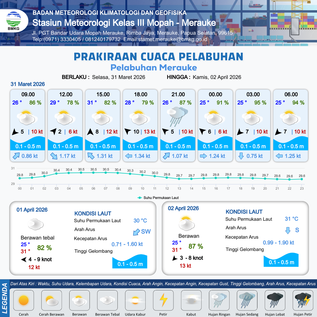 31 Mar 26, 21.00 2 jam kedepan | Berawan | Utara 2 kt Gust Peningkatan kecepatan angin yang singkat dan tiba-tiba : 5 kt | | | 8 km | 23 °C | 100 % | +0.34 m |