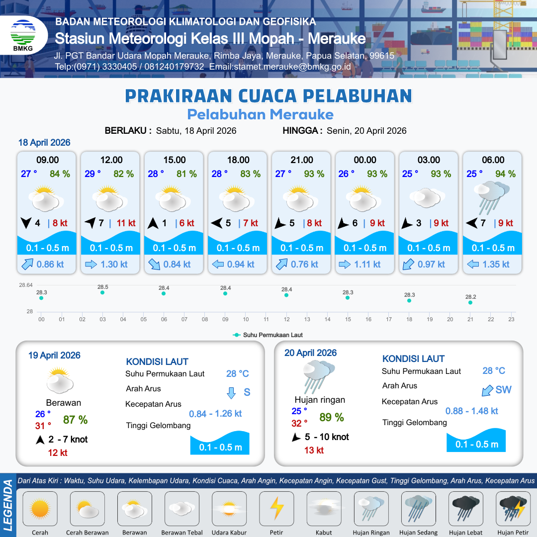 18 Apr 26, 06.00 4 jam kedepan | Barat 2 kt Gust Peningkatan kecepatan angin yang singkat dan tiba-tiba : 8 kt | 0.3 m Tenang | Barat Daya 1.2 Knot | 5 km | 27 °C | 91 % | +0.66 m | |