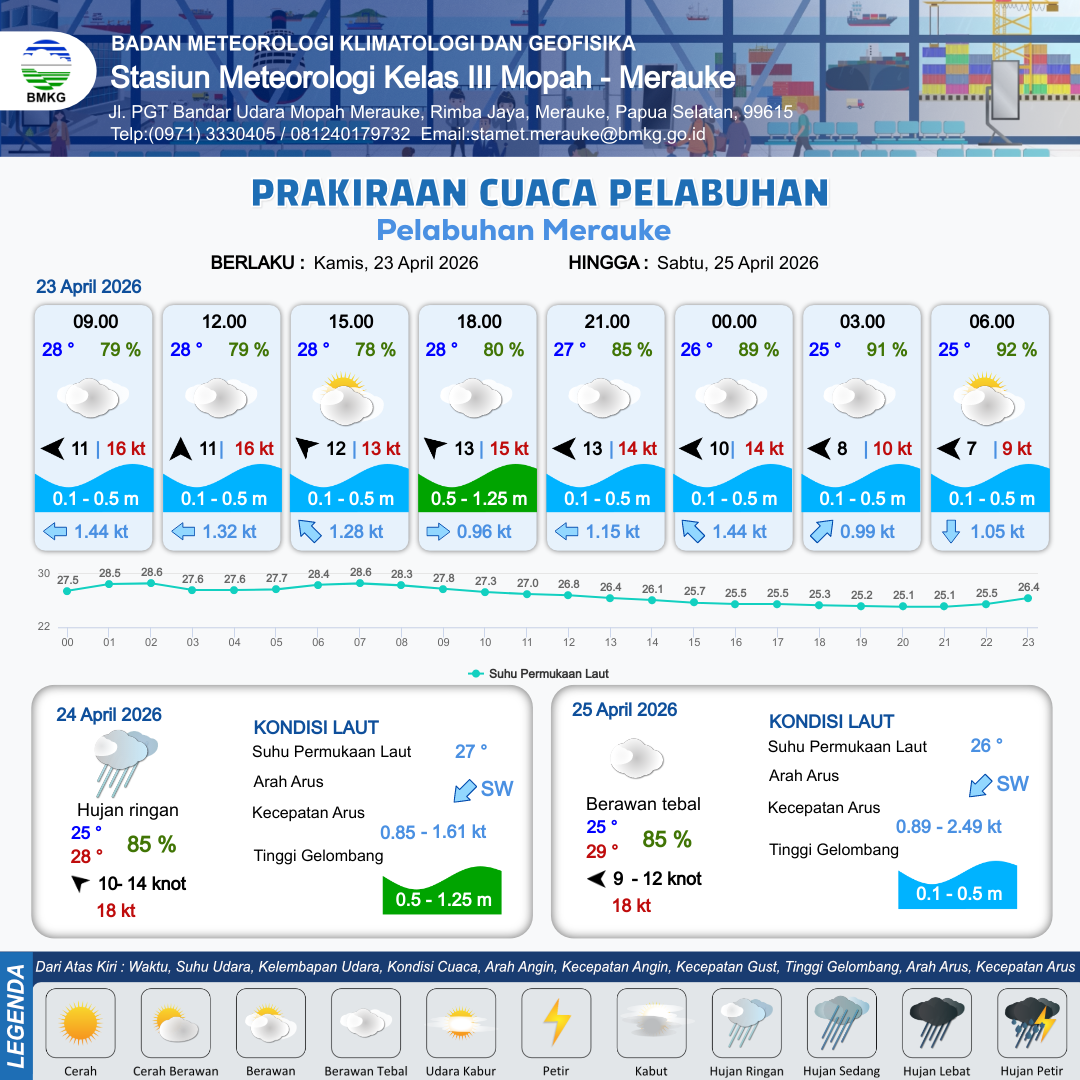 21 Apr 26, 08.00 12 jam yang lalu | Hujan Ringan | Timur 4 kt Gust Peningkatan kecepatan angin yang singkat dan tiba-tiba : 8 kt | | | 9 km | 26 °C | 96 % | +0.84 m |