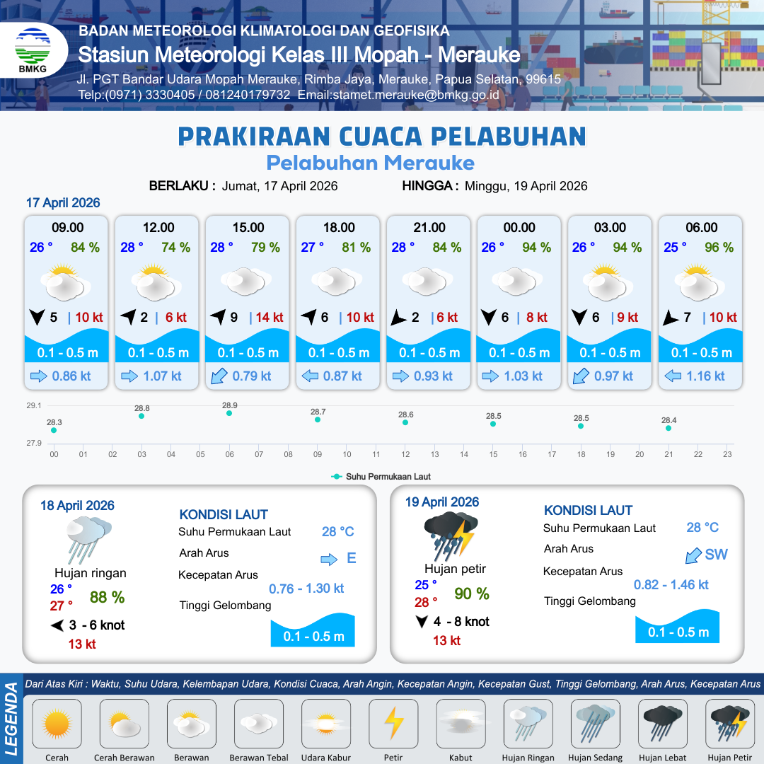 17 Apr 26, 07.00 8 jam kedepan | Barat Daya 4 kt Gust Peningkatan kecepatan angin yang singkat dan tiba-tiba : 11 kt | 0.3 m Tenang | Barat Daya 1.0 Knot | 10 km | 26 °C | 94 % | -0.63 m | |