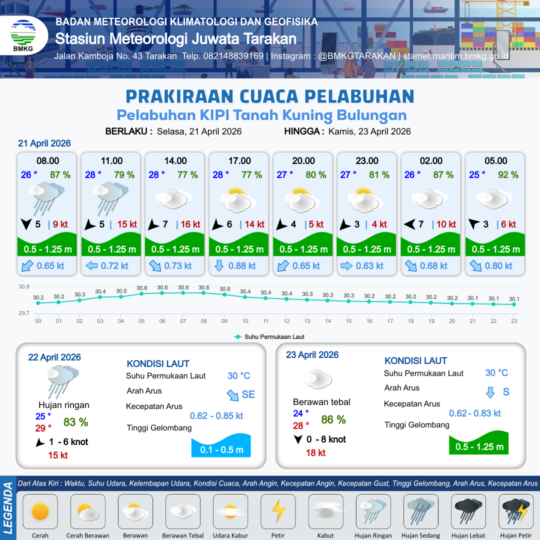 21 Apr 26, 09.00 24 jam kedepan | Utara 7 kt Gust Peningkatan kecepatan angin yang singkat dan tiba-tiba : 16 kt | 0.8 m Rendah | Selatan 1.0 Knot | 10 km | 28 °C | 76 % | -0.30 m | |
