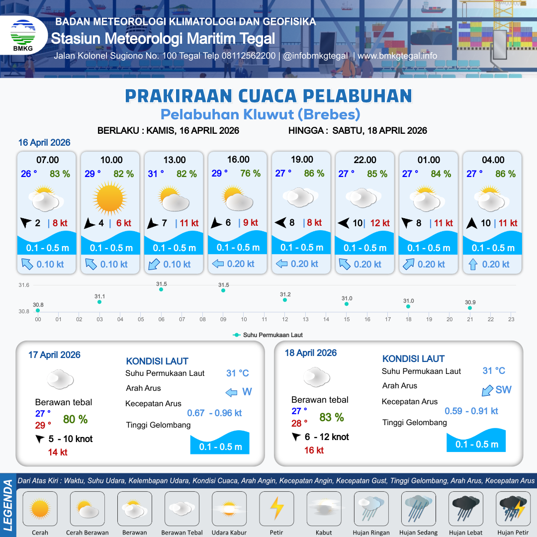 16 Apr 26, 07.00 12 jam yang lalu | Cerah Berawan | Timur Laut 7 kt Gust Peningkatan kecepatan angin yang singkat dan tiba-tiba : 12 kt | | | 8 km | 31 °C | 80 % | +0.62 m |