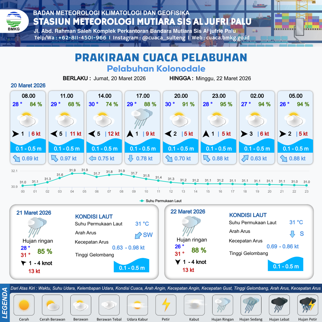 19 Mar 26, 23.00 3 jam kedepan | Berawan | Barat Daya 2 kt Gust Peningkatan kecepatan angin yang singkat dan tiba-tiba : 7 kt | | | 10 km | 25 °C | 84 % | -0.60 m |