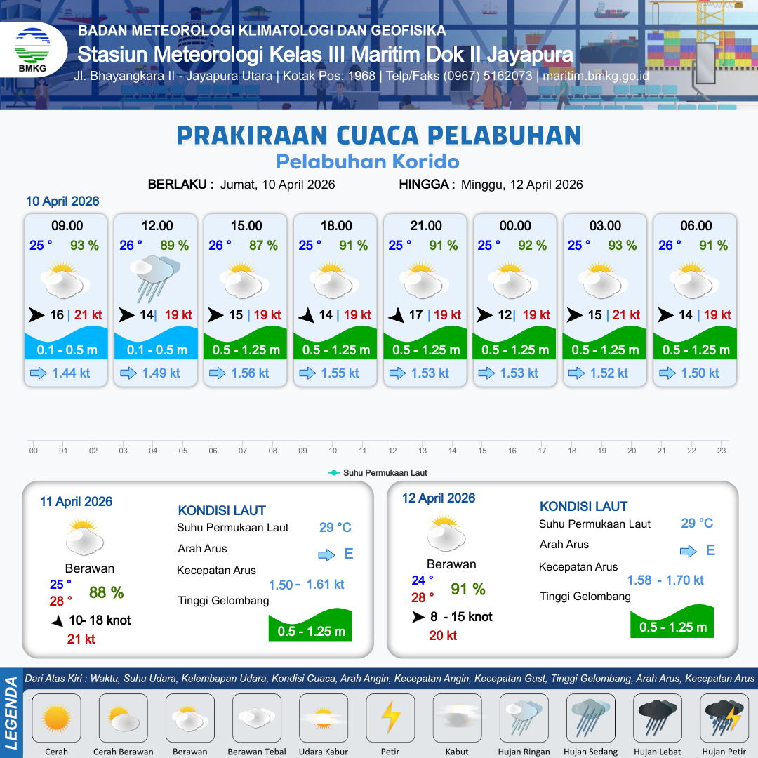 10 Apr 26, 15.00 12 jam kedepan | Barat 12 kt Gust Peningkatan kecepatan angin yang singkat dan tiba-tiba : 19 kt | 0.7 m Rendah | Timur 1.5 Knot | 7 km | 25 °C | 92 % | +0.69 m | |