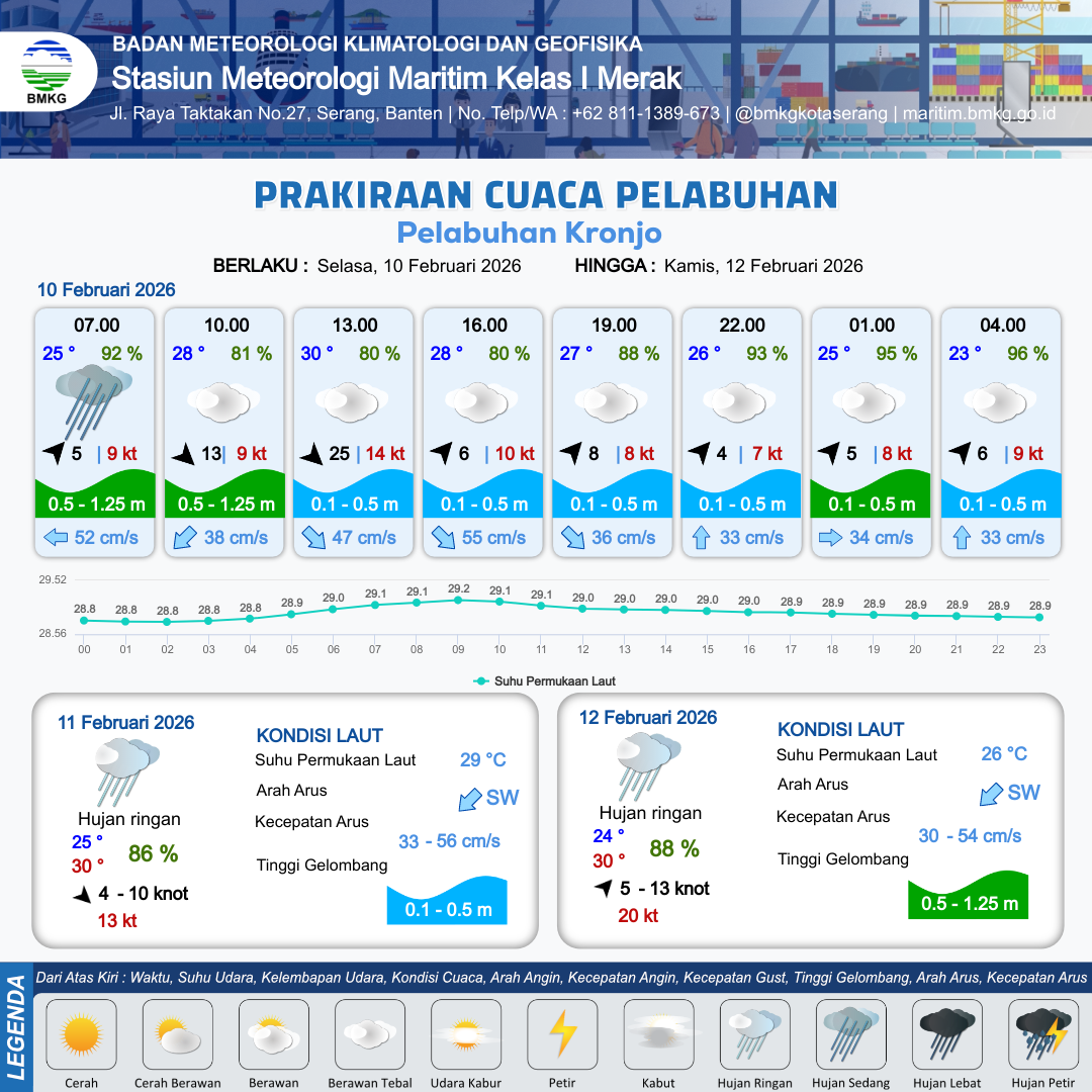 9 Feb 26, 23.00 3 jam kedepan | Hujan Lebat | Barat Daya 5 kt Gust Peningkatan kecepatan angin yang singkat dan tiba-tiba : 12 kt | | | 5 km | 24 °C | 94 % | +0.28 m |