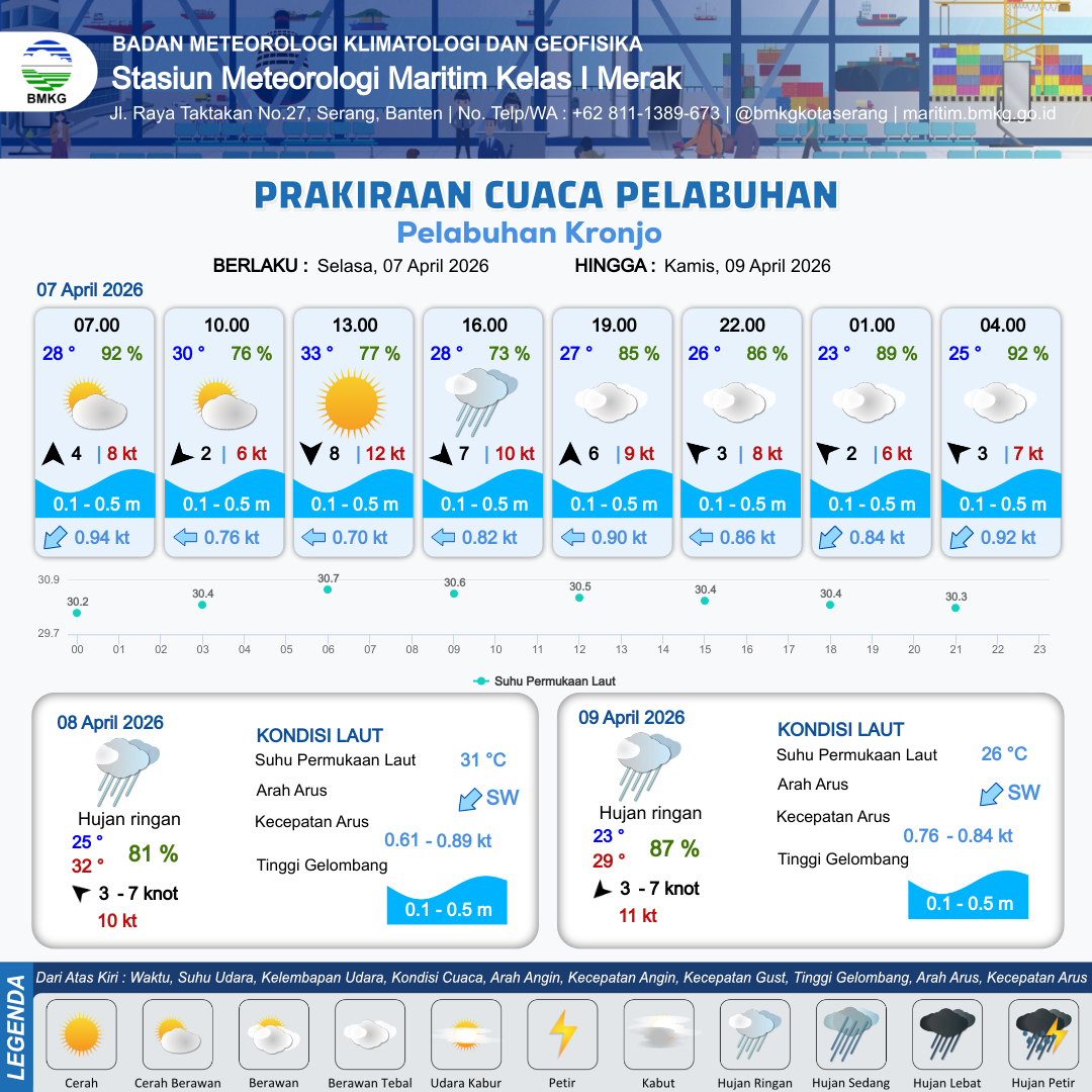 6 Apr 26, 07.00 12 jam yang lalu | Berawan Tebal | Timur Laut 9 kt Gust Peningkatan kecepatan angin yang singkat dan tiba-tiba : 11 kt | | | 10 km | 30 °C | 79 % | +0.68 m |