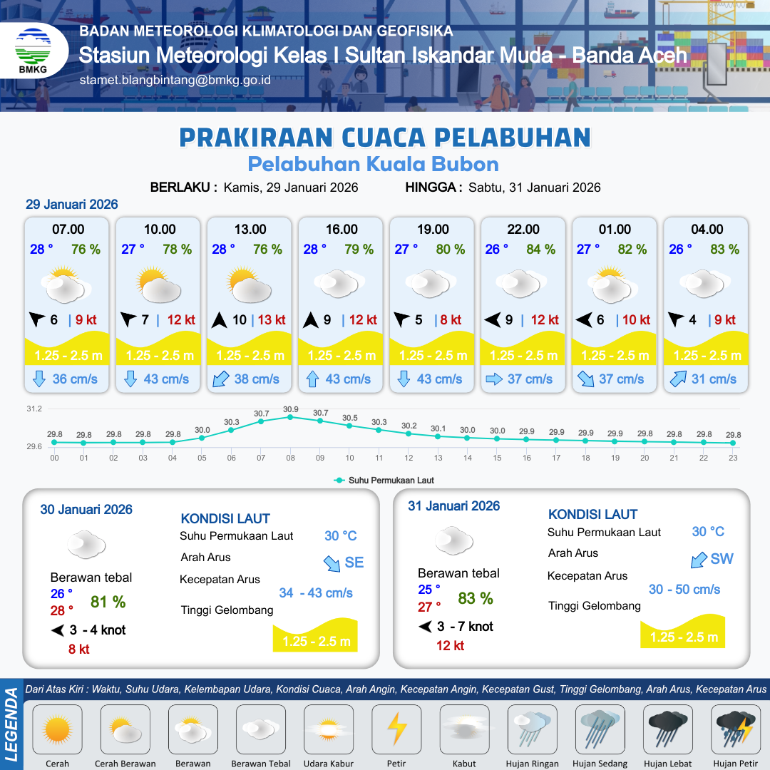 29 Jan 26, 22.00 8 jam kedepan | Tenggara 4 kt Gust Peningkatan kecepatan angin yang singkat dan tiba-tiba : 9 kt | 1.4 m Sedang | Utara 32.0 cm/s | 10 km | 26 °C | 83 % | -0.06 m | |