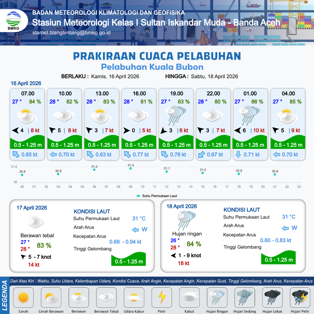 16 Apr 26, 10.00 9 jam kedepan | Barat 0 kt Gust Peningkatan kecepatan angin yang singkat dan tiba-tiba : 6 kt | 0.8 m Rendah | Barat Laut 0.8 Knot | 10 km | 27 °C | 86 % | +0.00 m | |