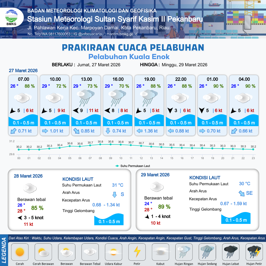 27 Mar 26, 08.00 6 jam kedepan | Timur 8 kt Gust Peningkatan kecepatan angin yang singkat dan tiba-tiba : 9 kt | 0.4 m Tenang | Selatan 0.7 Knot | 9 km | 29 °C | 70 % | -1.61 m | |