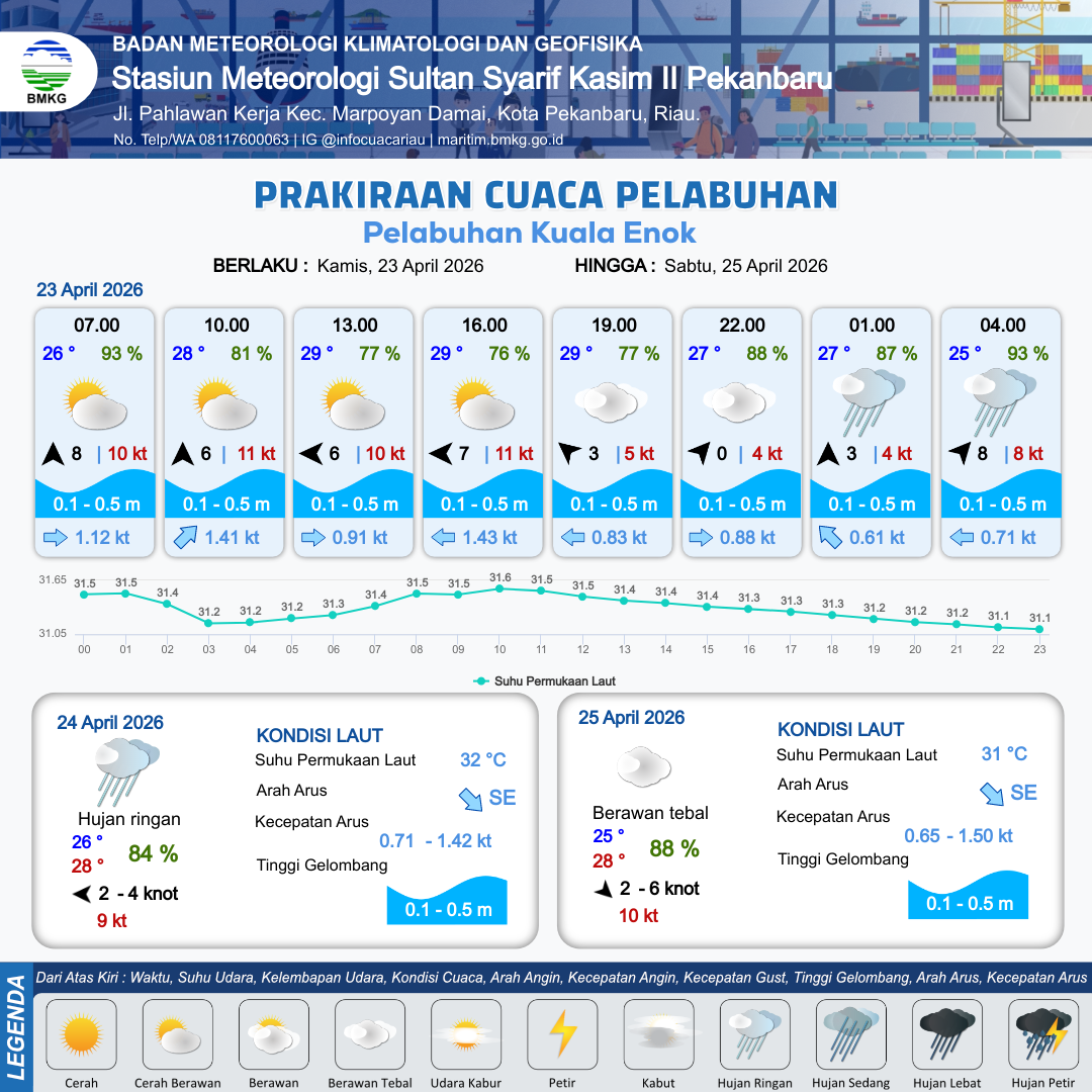 23 Apr 26, 00.00 23 jam kedepan | Barat Daya 5 kt Gust Peningkatan kecepatan angin yang singkat dan tiba-tiba : 8 kt | 0.2 m Tenang | Timur 1.2 Knot | 6 km | 25 °C | 92 % | +1.28 m | |