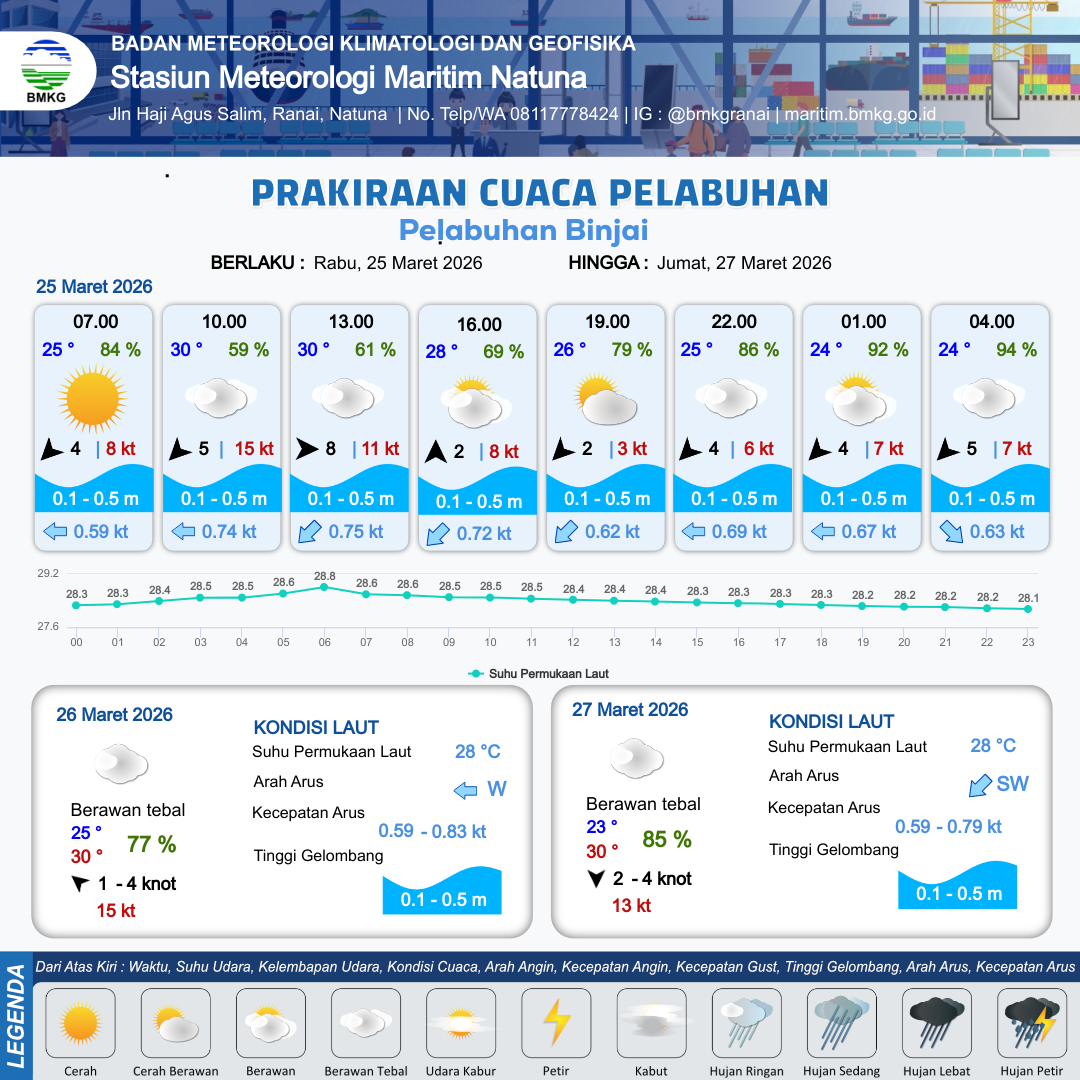 25 Mar 26, 12.00 2 jam kedepan | Barat 3 kt Gust Peningkatan kecepatan angin yang singkat dan tiba-tiba : 5 kt | 0.5 m Rendah | Utara 0.9 Knot | 10 km | 28 °C | 81 % | +0.42 m | |