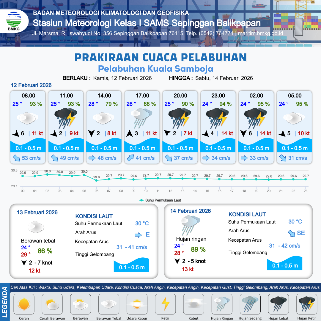 12 Feb 26, 23.00 4 jam kedepan | Berawan Tebal | Utara 7 kt Gust Peningkatan kecepatan angin yang singkat dan tiba-tiba : 10 kt | | | 10 km | 24 °C | 95 % | +0.04 m |