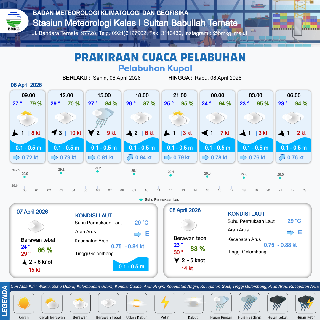 7 Apr 26, 03.00 2 jam kedepan | Barat 2 kt Gust Peningkatan kecepatan angin yang singkat dan tiba-tiba : 14 kt | 0.3 m Tenang | Timur 0.8 Knot | 10 km | 29 °C | 74 % | +0.69 m | |