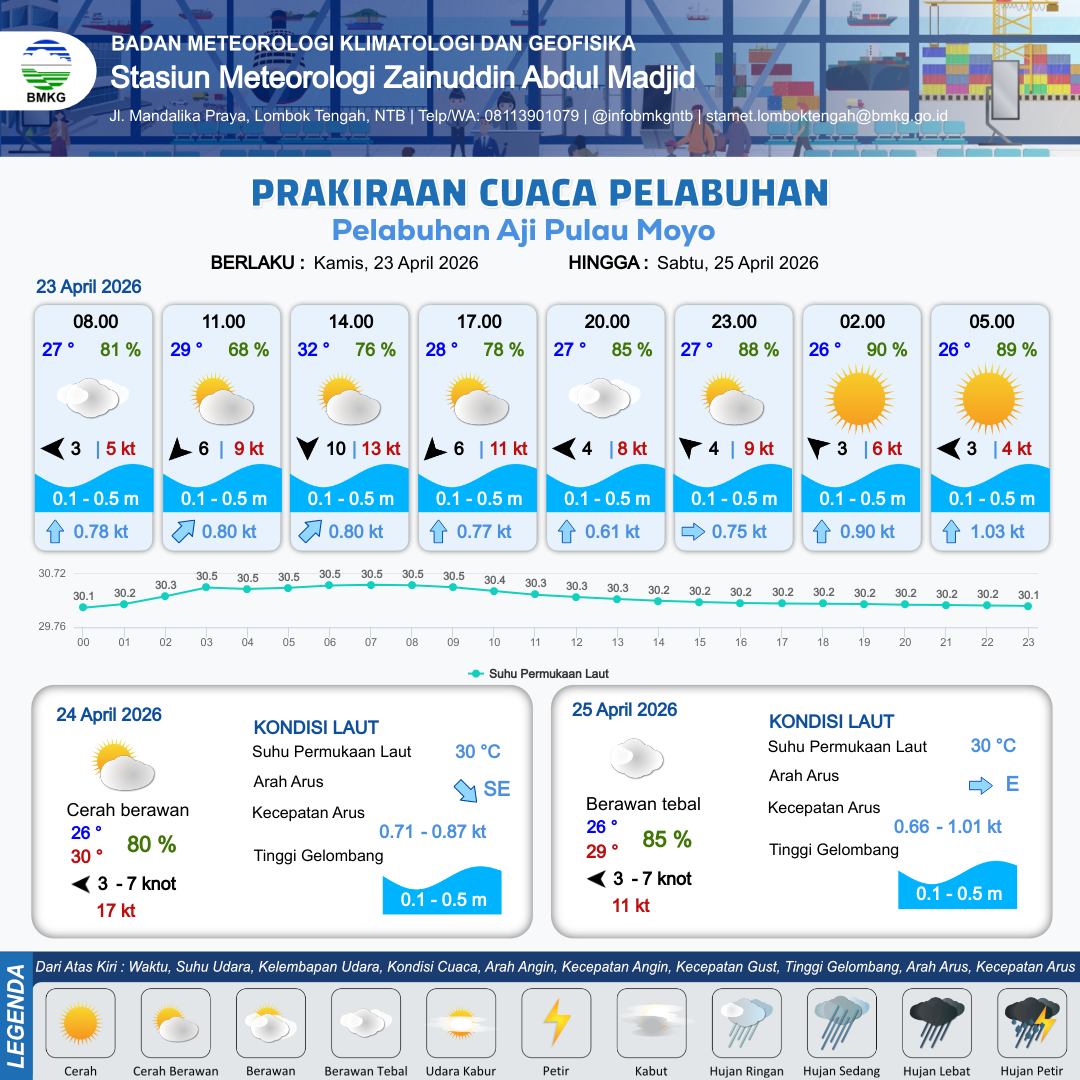 23 Apr 26, 07.00 24 jam kedepan | Utara 10 kt Gust Peningkatan kecepatan angin yang singkat dan tiba-tiba : 14 kt | 0.2 m Tenang | Timur Laut 0.8 Knot | 8 km | 31 °C | 77 % | +0.50 m | |