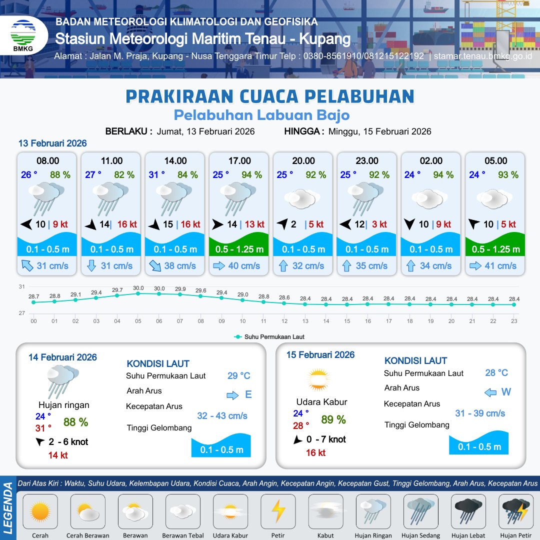 13 Feb 26, 15.00 4 jam kedepan | Timur 12 kt Gust Peningkatan kecepatan angin yang singkat dan tiba-tiba : 3 kt | 0.5 m Rendah | Utara 35.0 cm/s | 8 km | 25 °C | 92 % | +0.35 m | |