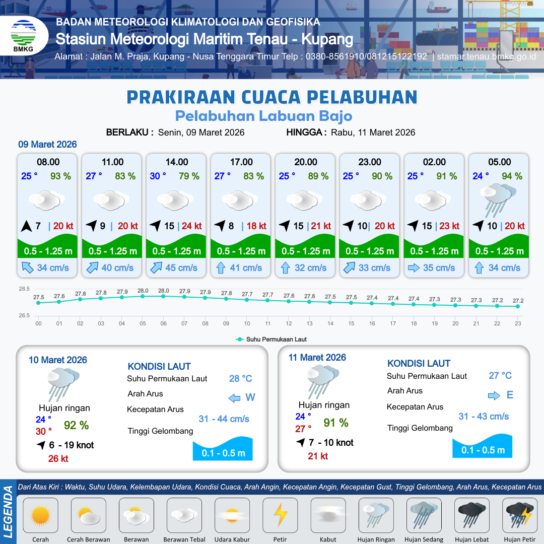 9 Mar 26, 03.00 14 jam yang lalu | Berawan Tebal | Barat Daya 9 kt Gust Peningkatan kecepatan angin yang singkat dan tiba-tiba : 20 kt | | | 10 km | 27 °C | 83 % | -0.43 m |