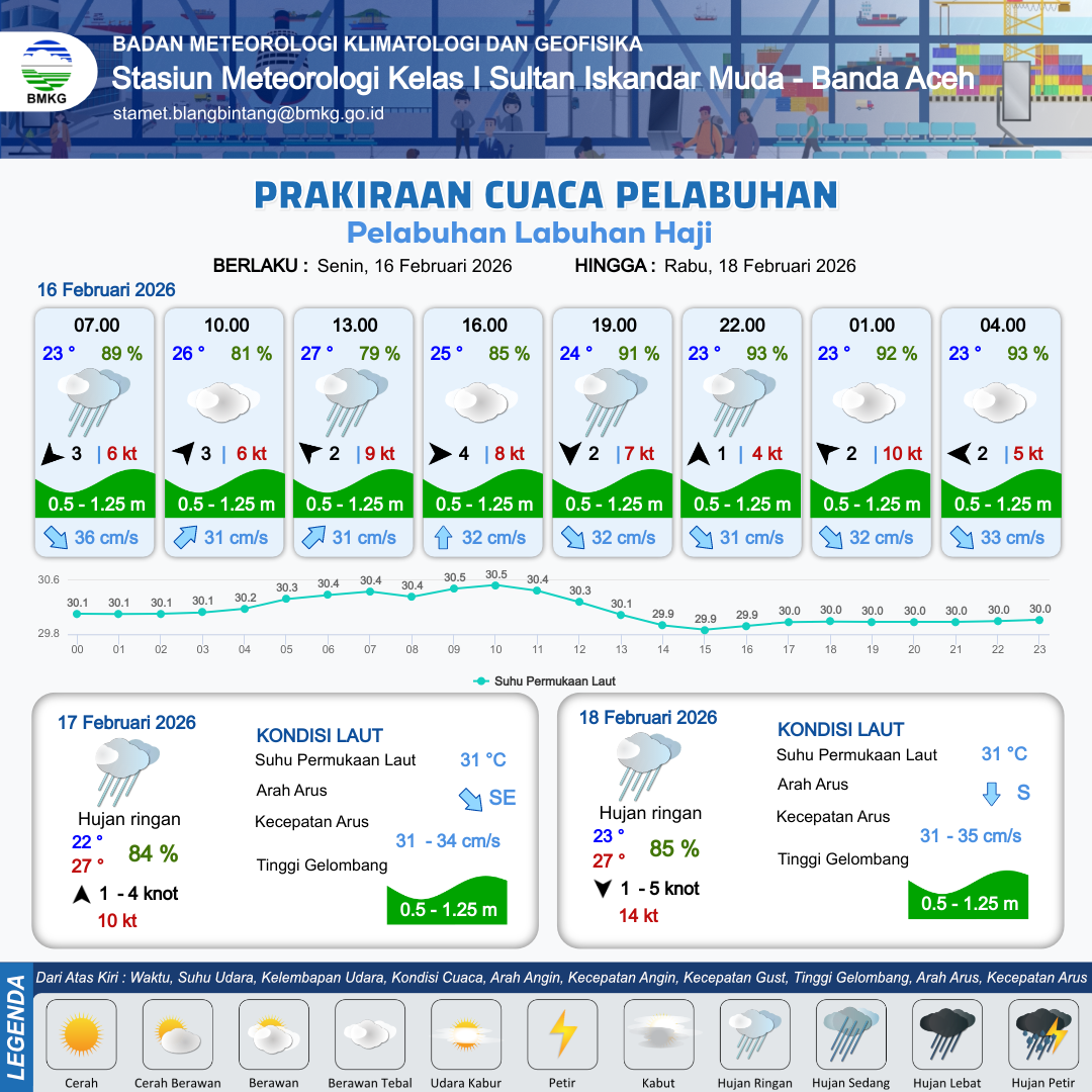 16 Feb 26, 02.00 17 jam yang lalu | Berawan Tebal | Barat Daya 3 kt Gust Peningkatan kecepatan angin yang singkat dan tiba-tiba : 6 kt | | | 10 km | 25 °C | 88 % | -0.16 m |