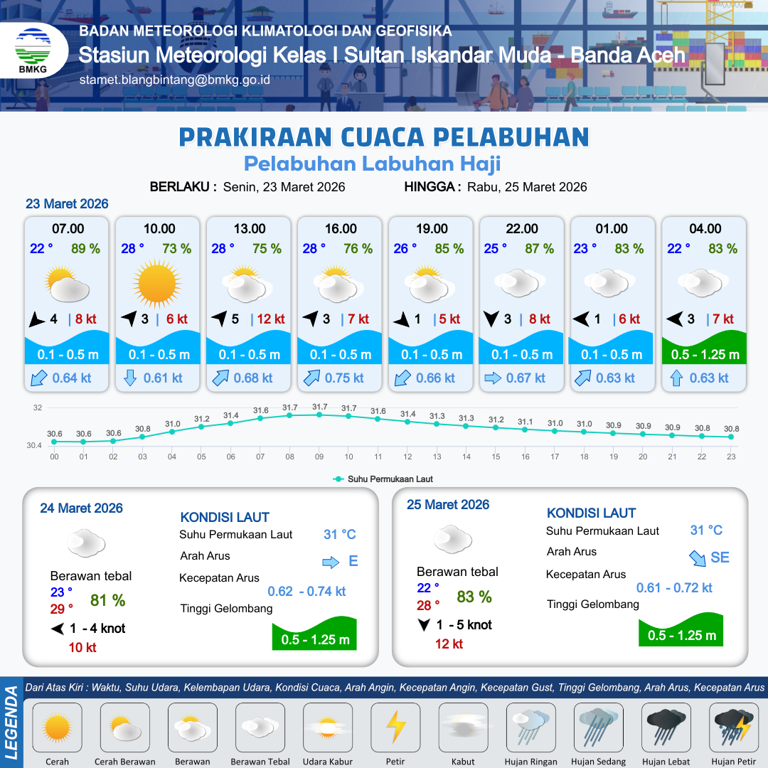23 Mar 26, 07.00 6 jam kedepan | Barat Daya 5 kt Gust Peningkatan kecepatan angin yang singkat dan tiba-tiba : 11 kt | 0.5 m Rendah | Timur Laut 0.7 Knot | 10 km | 28 °C | 77 % | -0.29 m | |
