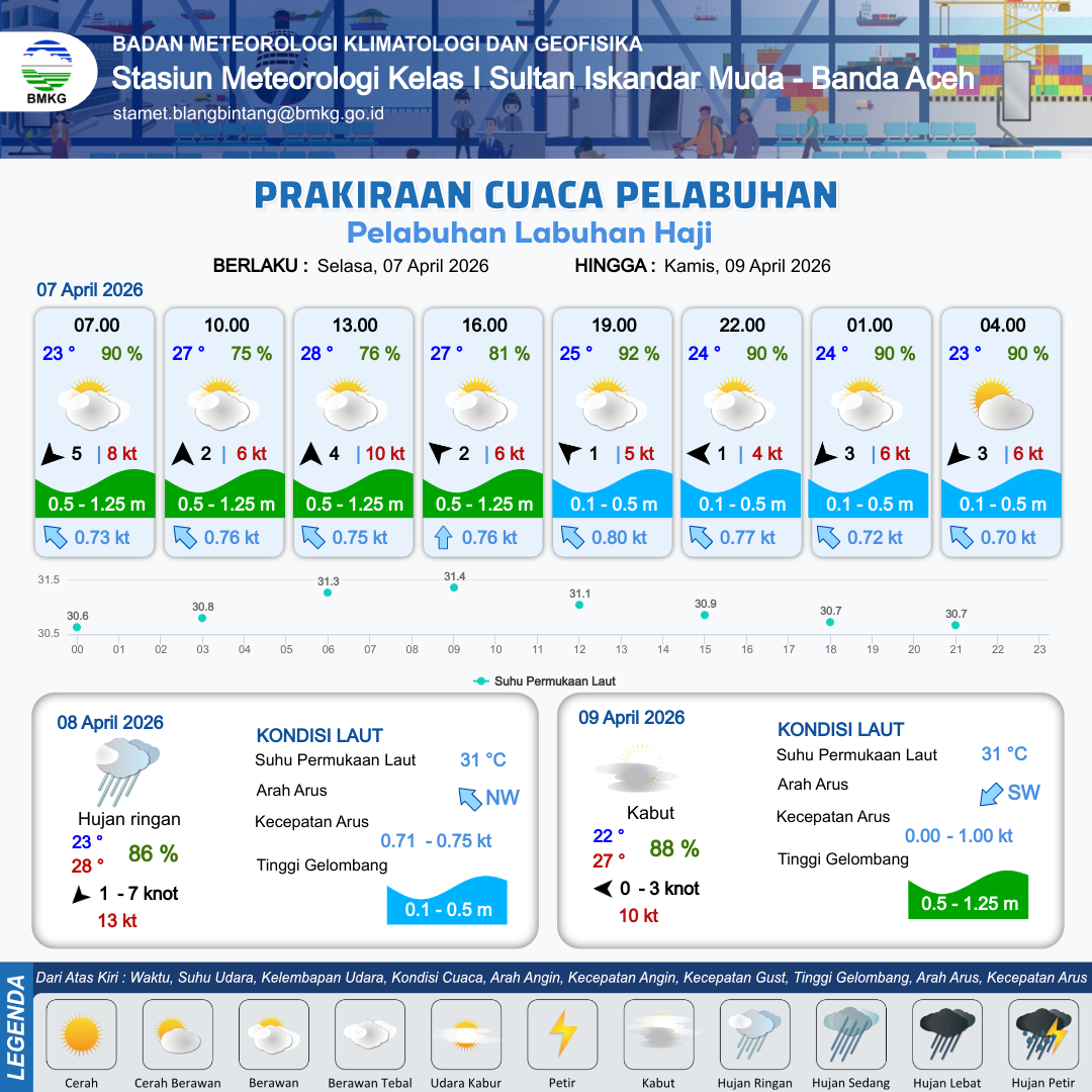 7 Apr 26, 14.00 12 jam kedepan | Timur 1 kt Gust Peningkatan kecepatan angin yang singkat dan tiba-tiba : 4 kt | 0.5 m Rendah | Barat Laut 0.8 Knot | 10 km | 25 °C | 89 % | +0.00 m | |