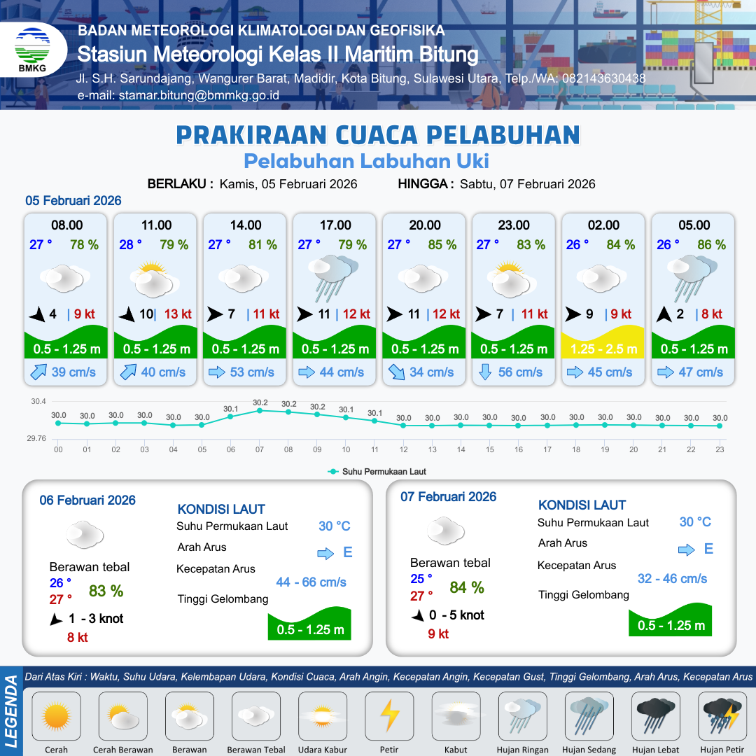 5 Feb 26, 05.00 2 jam kedepan | Barat 7 kt Gust Peningkatan kecepatan angin yang singkat dan tiba-tiba : 15 kt | 0.7 m Rendah | Timur 57.0 cm/s | 8 km | 28 °C | 80 % | -0.39 m | |