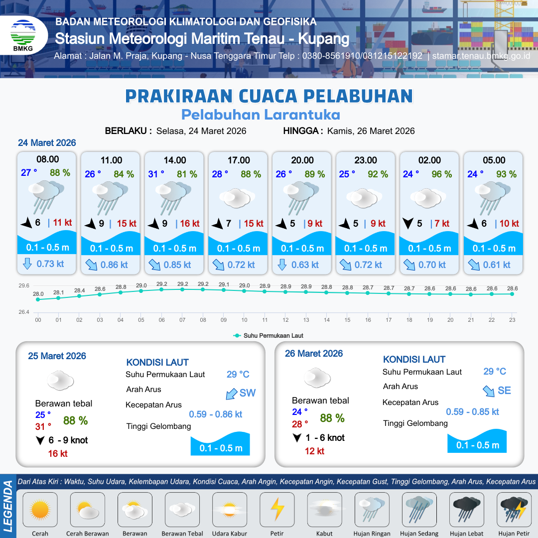 24 Mar 26, 08.00 11 jam yang lalu | Berawan Tebal | Barat Laut 7 kt Gust Peningkatan kecepatan angin yang singkat dan tiba-tiba : 15 kt | | | 8 km | 29 °C | 83 % | +0.74 m |