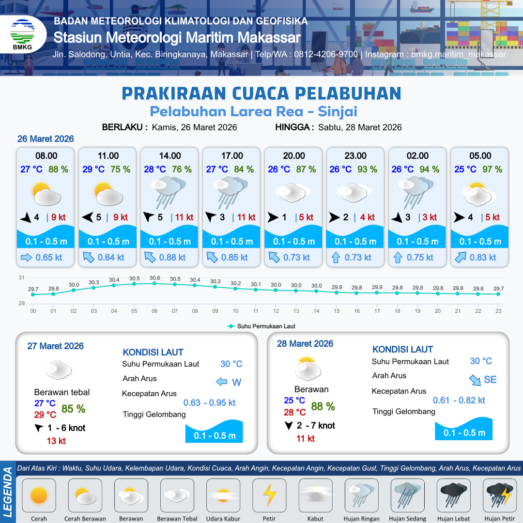26 Mar 26, 10.00 9 jam yang lalu | Berawan Tebal | Tenggara 3 kt Gust Peningkatan kecepatan angin yang singkat dan tiba-tiba : 7 kt | | | 10 km | 27 °C | 87 % | +0.84 m |